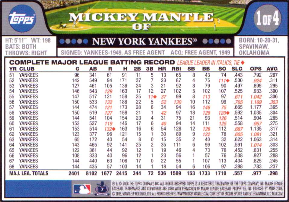Well it's been over a week since I left a blog and I'm sorry for that. I went on a trip to Mississippi to visit some family but don't worry, I hit up the discount section of their Wal-Mart while there. I picked up a couple of boxes of mixed year and brand cards. I haven't opened any of them yet however each box had a card just sitting in a little protective sleeve. Sooo here they are. The first one is a Mickey Mantle 1 or 4 All-Star giveaway card:
